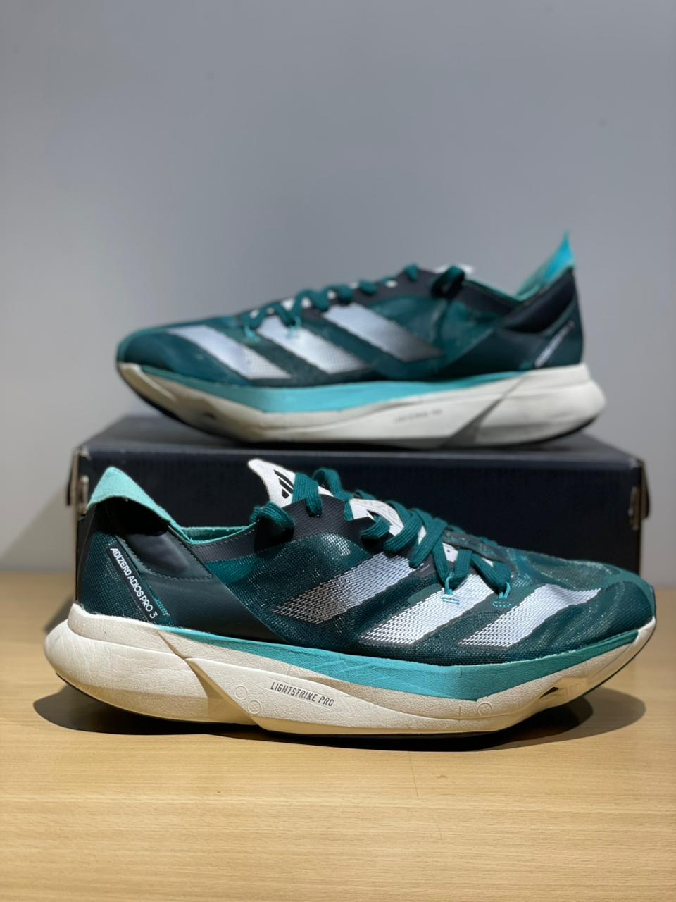 The Adidas Adizero Pro 3 Teal Running Shoes delivers elite performance technology through advanced engineering optimized for competitive distance racing applications. This specialized silhouette features lightweight construction combined with responsive cushioning systems that maximize energy efficiency during sustained high-intensity efforts. The teal colorway introduces distinctive visual presence while maintaining professional aesthetics suitable for competitive racing environments. Premium engineered materials provide targeted breathability and structural support while minimizing overall weight, critical for performance during demanding training cycles and race events. The propulsive midsole technology translates runner biomechanics into measurable forward momentum advantages, while precision-engineered outsole design ensures reliable traction across varied racing surfaces. Built with adidas performance expertise and validated through rigorous athlete testing protocols, this shoe appeals to serious competitors pursuing personal records and competitive achievements. The Adizero Pro 3 Teal represents a substantive investment in performance footwear, positioning it as the premier choice for dedicated runners seeking cutting-edge racing technology with proven competitive advantages and reliable professional-grade construction standards.